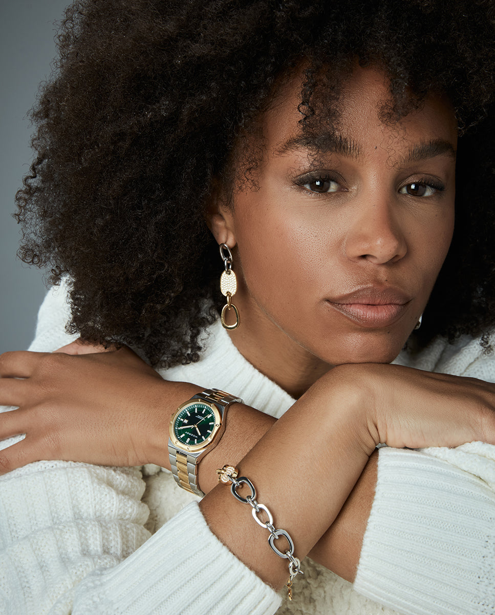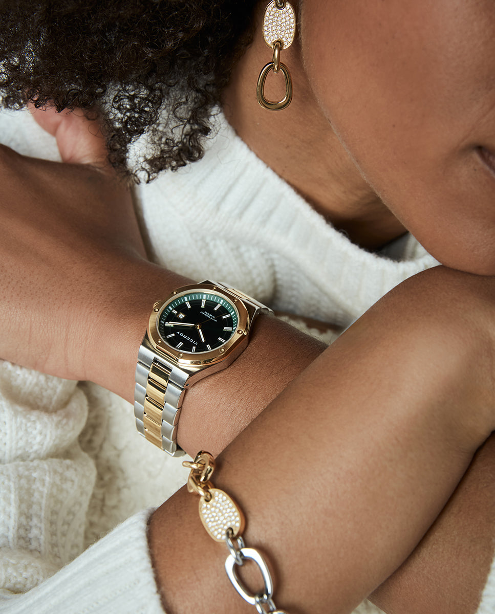 Reloj caja bitono de acero Ip dorado 10 Atm, brazalete bitono acero e Ip dorado, movimiento cuarzo