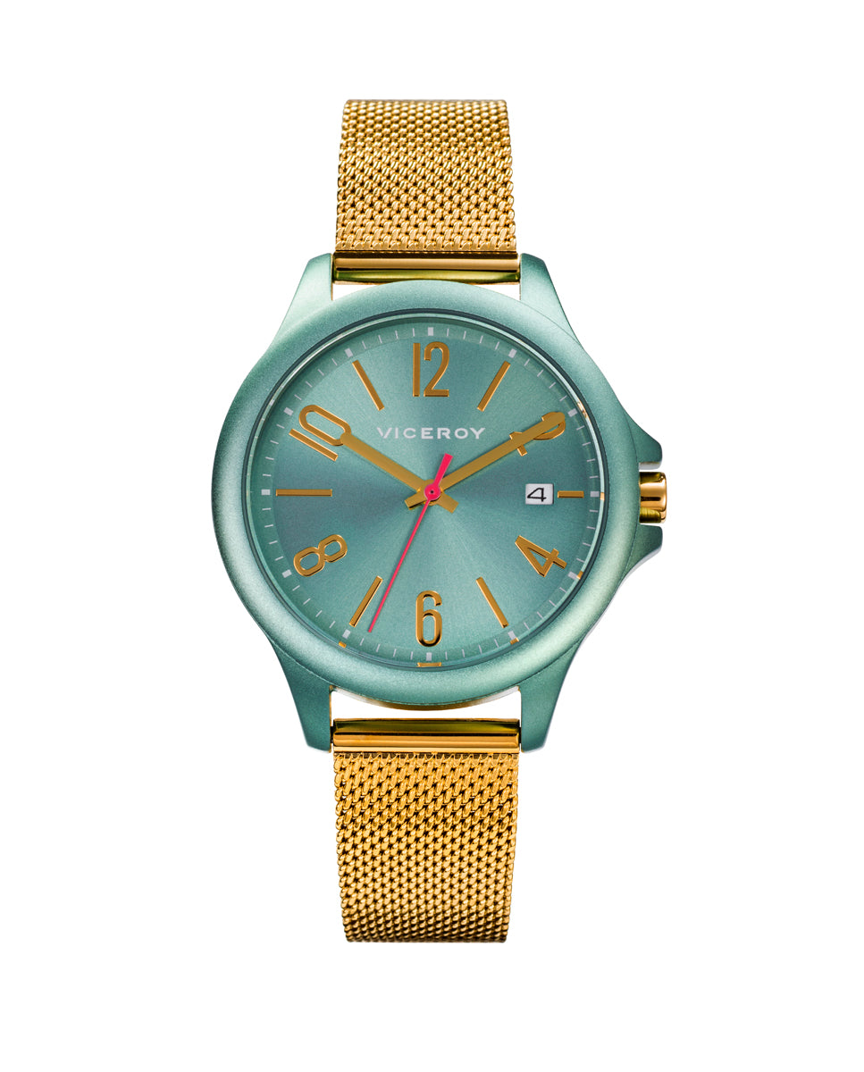 Reloj de mujer Colours 3 agujas de aluminio verde y malla milanesa de acero con IP dorado