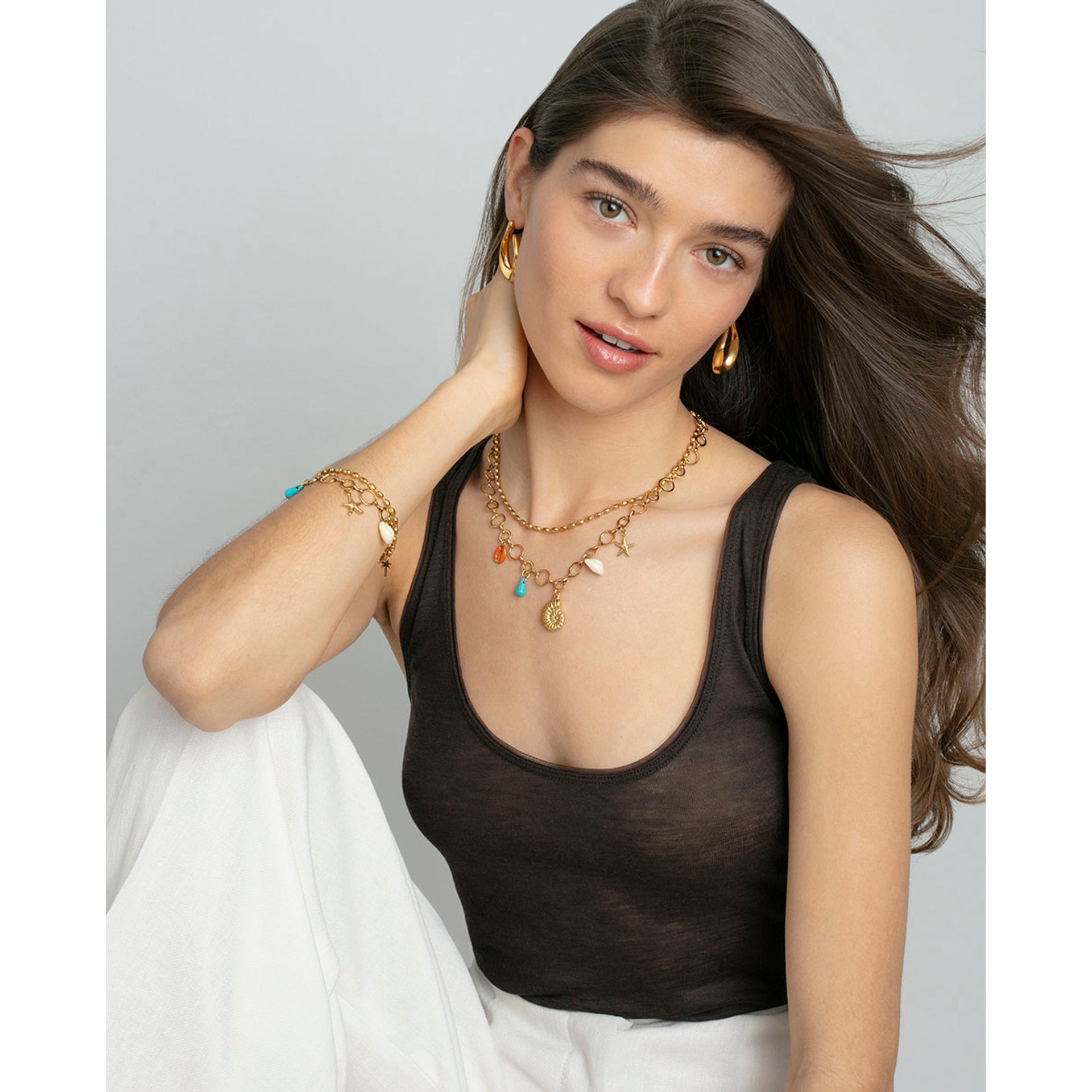 Pulseira feminina em aço Ip dourado com concha natural, pedra sintética e pingentes em aço