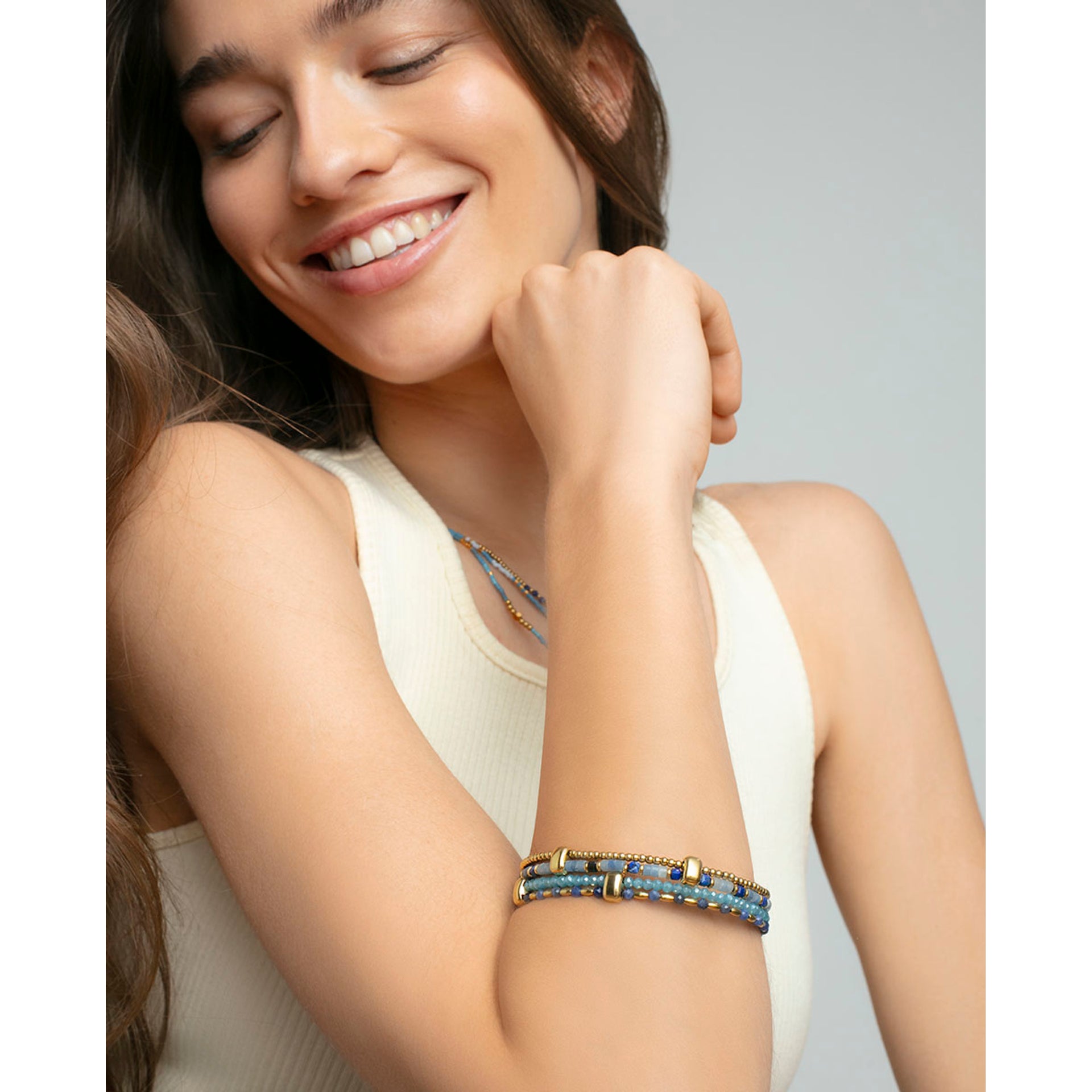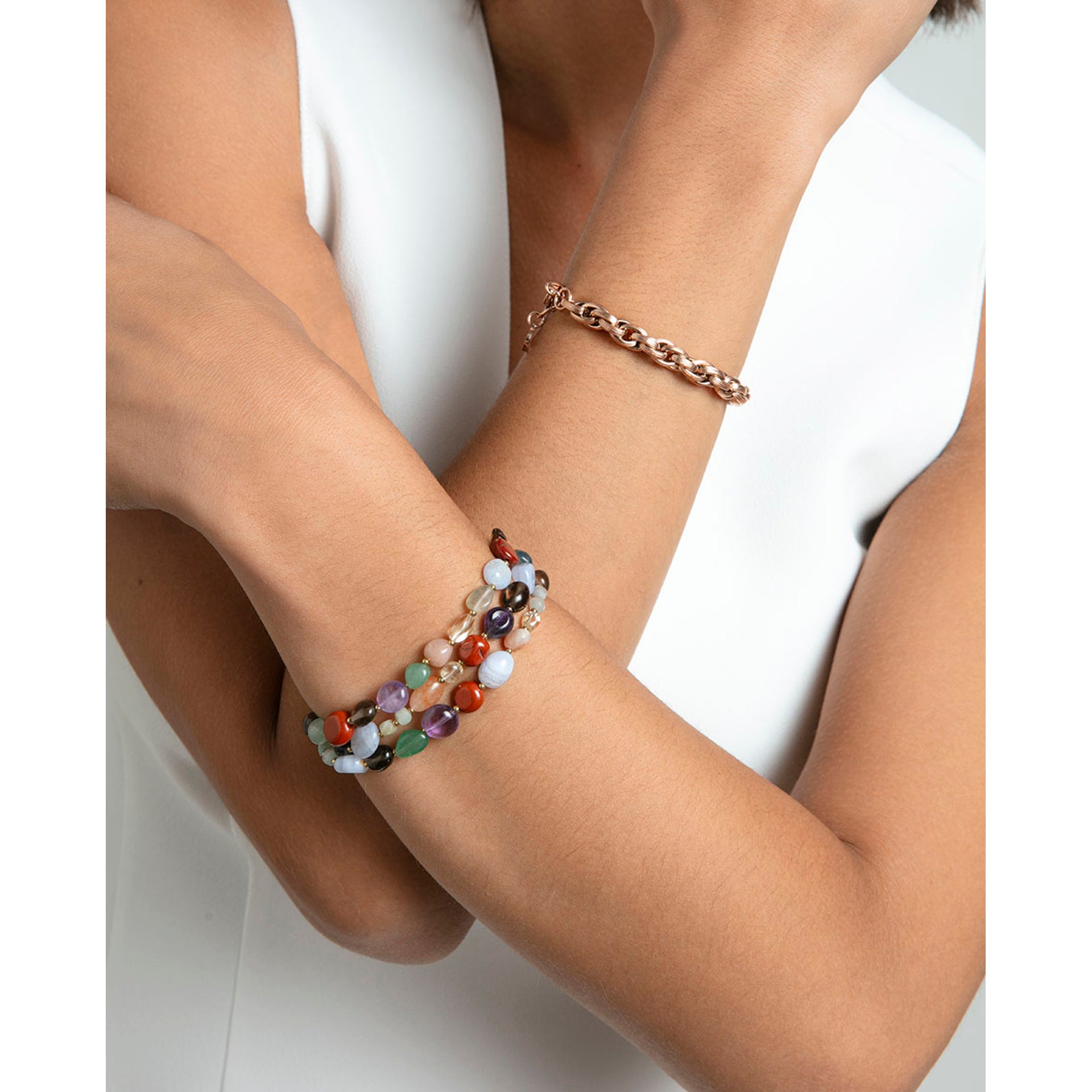 Pulseira Feminina Múltipla em Aço Ip Dourado com Pedras Naturais