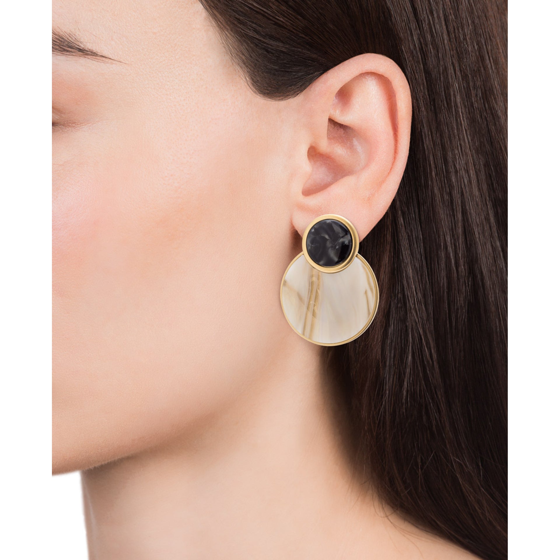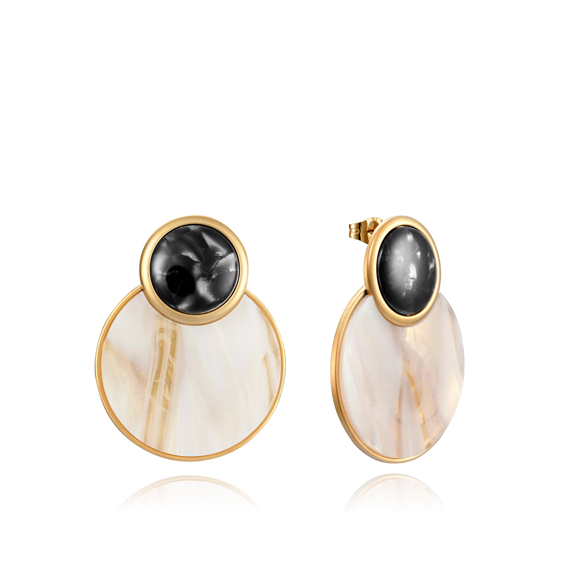 Brincos chiques em aço IP dourado compostos por dois discos de resina branca e preta