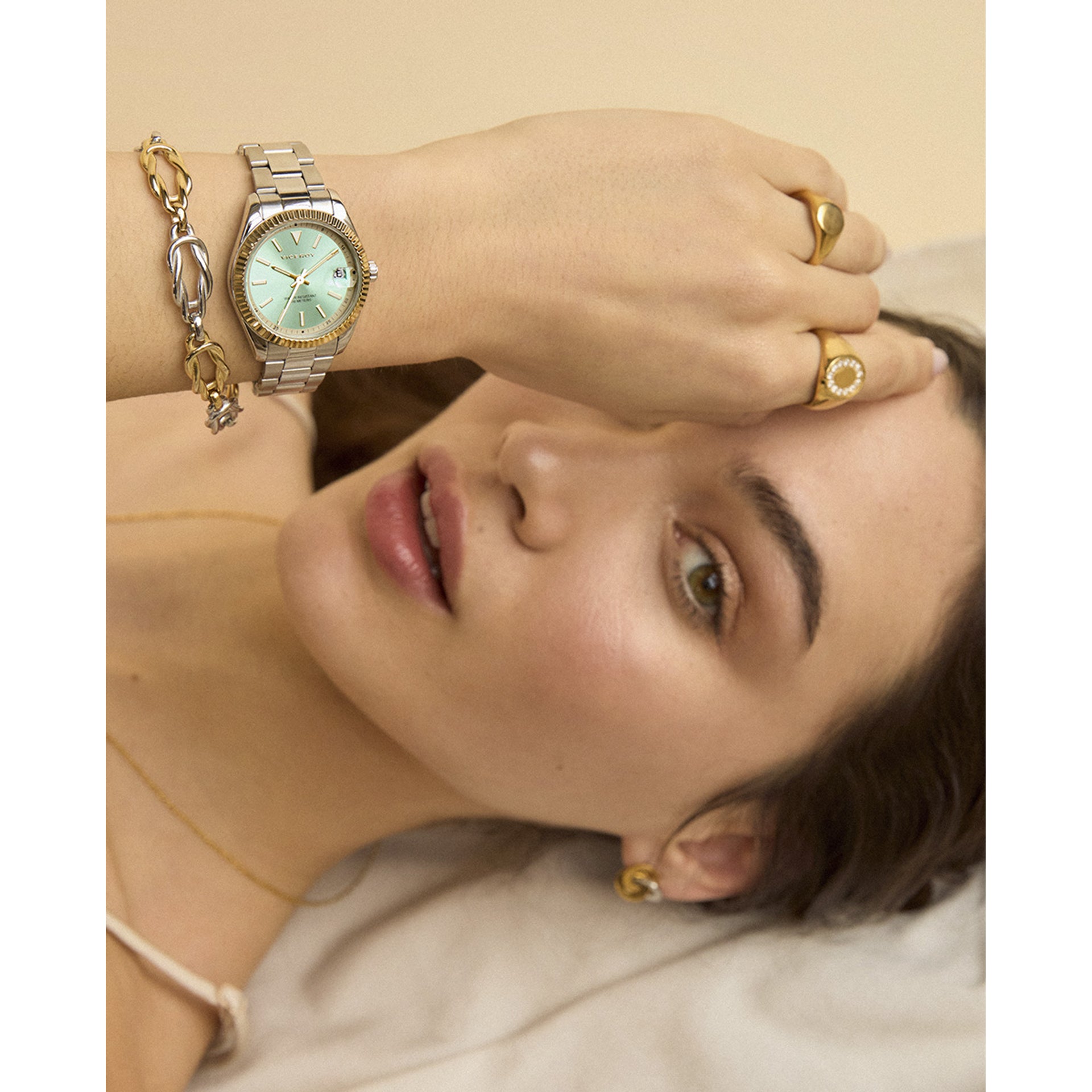 Reloj caja bitono de acero e Ip verde 10 Atm, brazalete de acero, movimiento cuarzo, colección Laura Escanes