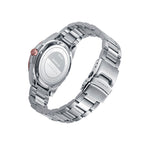 Relógio com caixa em aço, bisel azul de 20 atm e pulseira em aço com movimento quartzo
