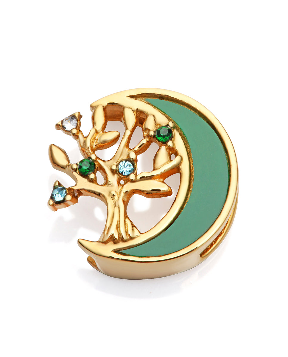 Motivo dourado em aço IP e resina com árvore da vida e lua verde para ser montado em uma pulseira feminina personalizável