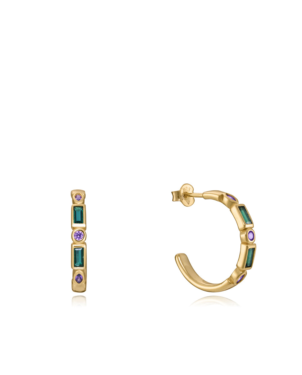 Elegantes brincos de prata esterlina banhados a ouro com zircões verdes e violetas