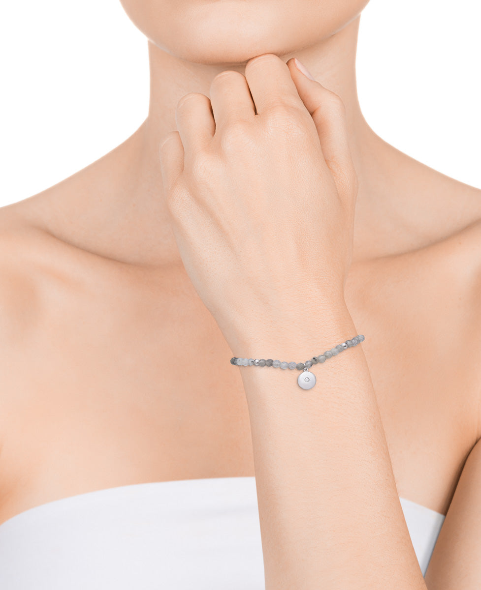 Pulseira Trend em prata elástica com labradorita cinza e disco central com zircônia