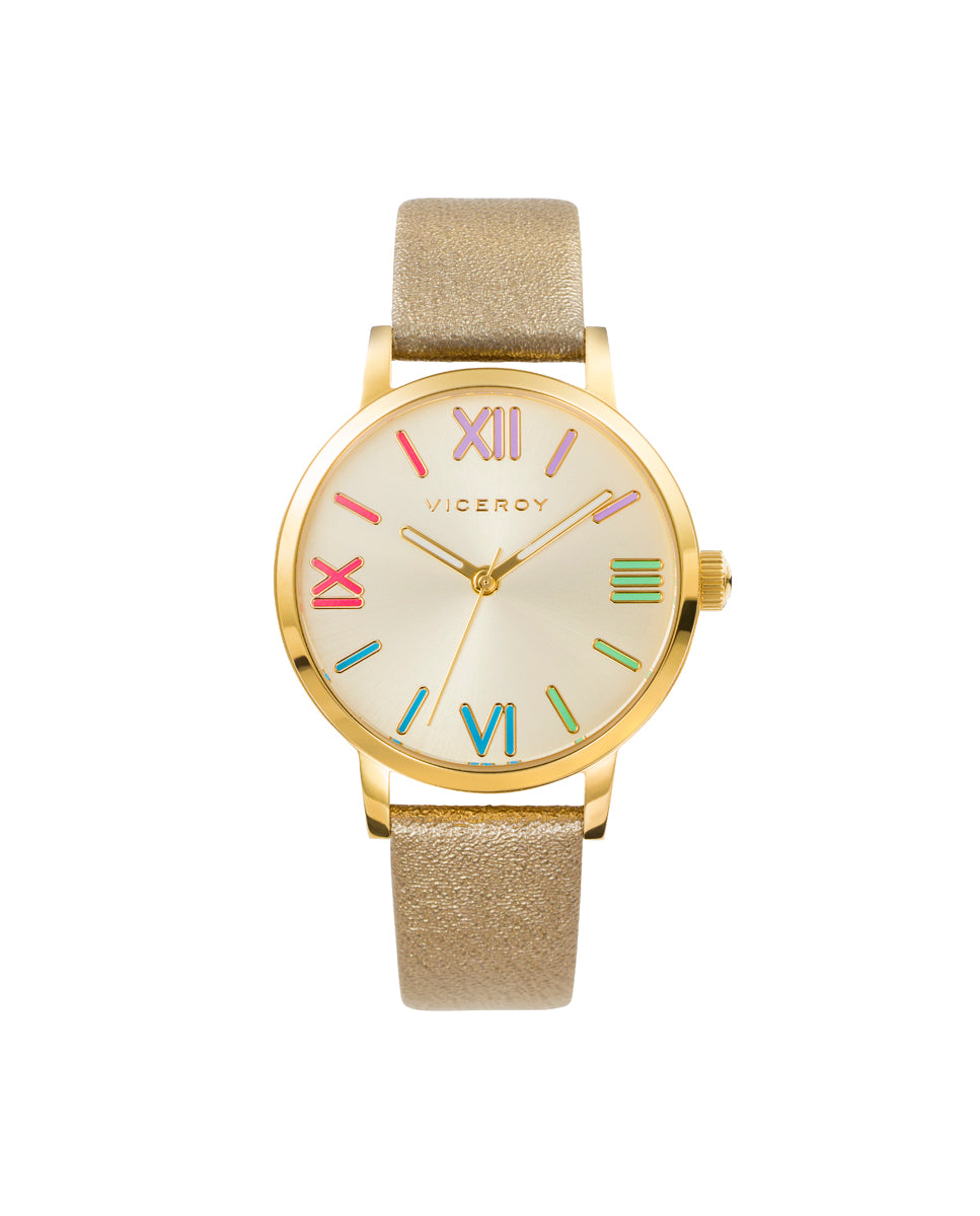 Relógio feminino Kiss com 3 ponteiros de aço com IP dourado e pulseira de couro marrom