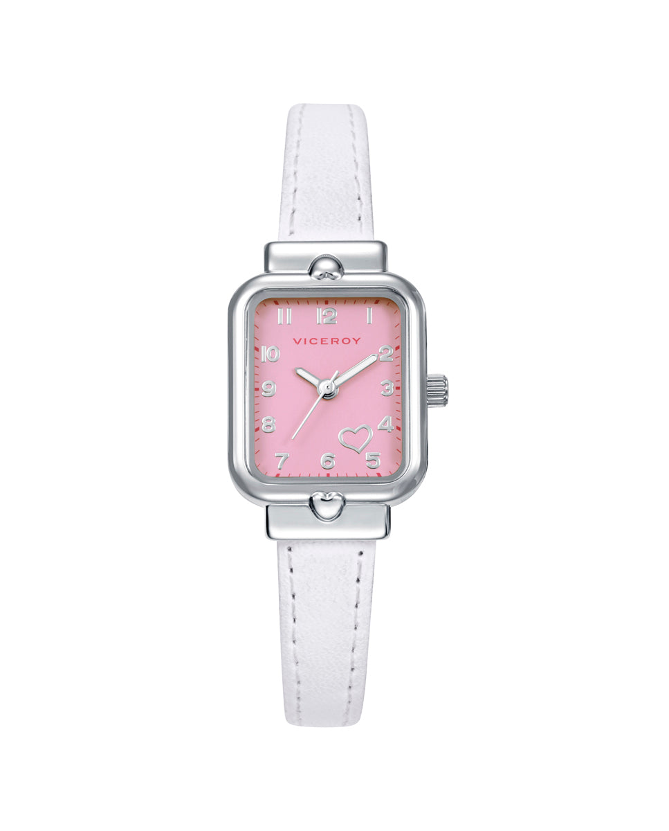 Relógio com caixa em aço inoxidável e pulseira em couro sintético branco, movimento de quartzo. Pulseira em prata de lei com cordão rosa e detalhe de coração incluída como brinde.