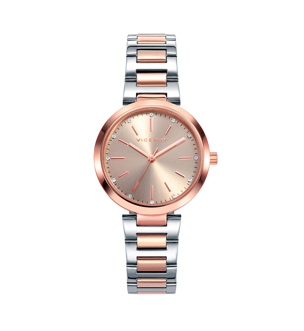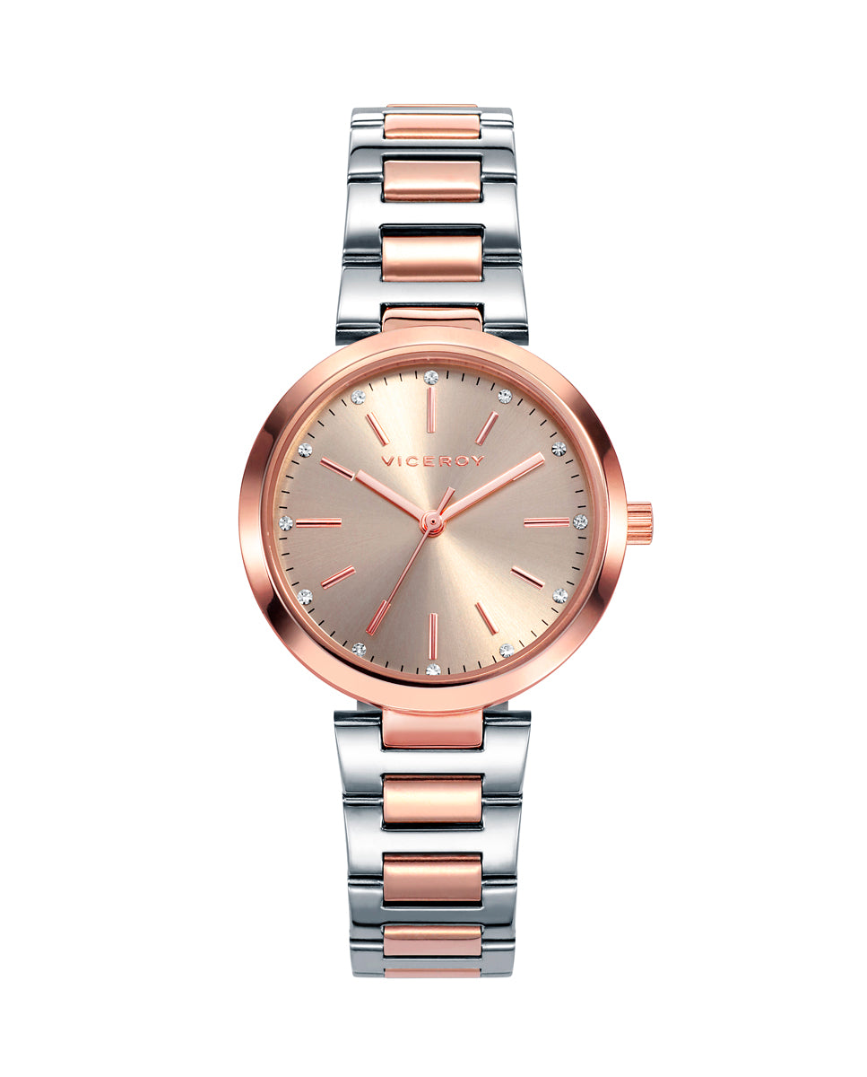Relógio feminino chique com 3 ponteiros de aço em dois tons com IP rosa